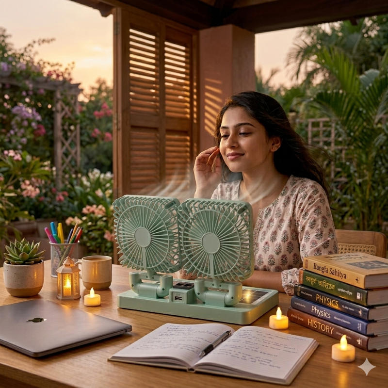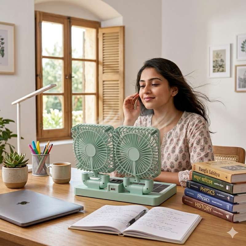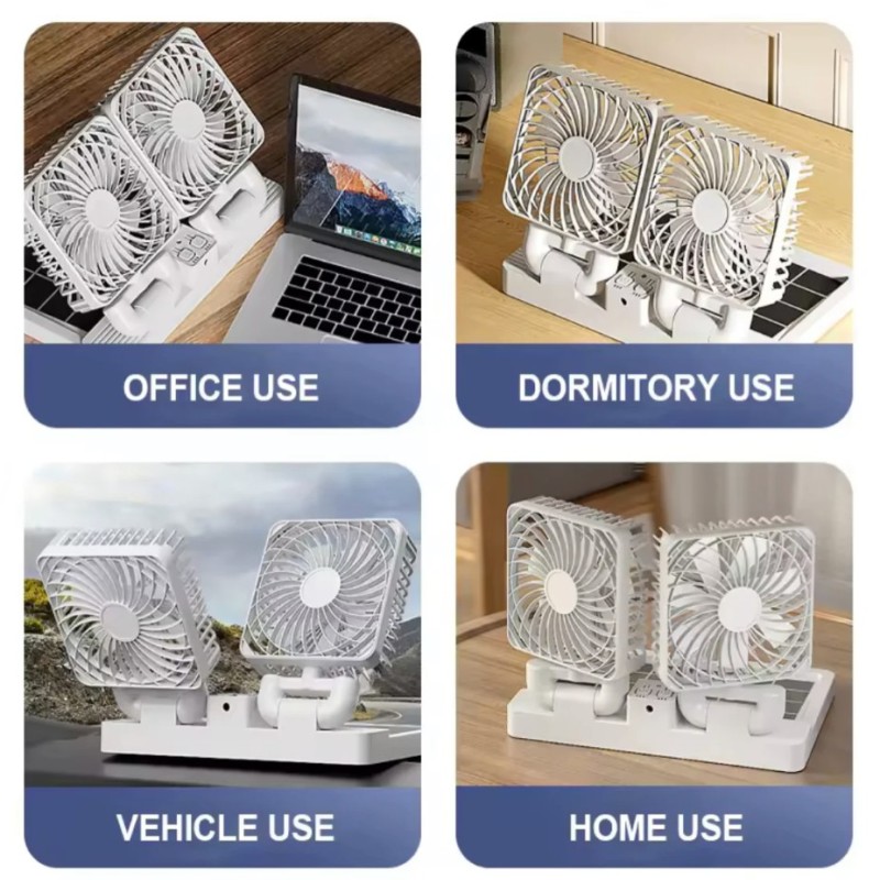 ৩৬০° রোটেটিং ডিজাইন: ফ্যান দুটিকে প্রয়োজন অনুযায়ী বিভিন্ন দিকে ঘুরিয়ে সেট করা যায়, ফলে একাধিক মানুষ একসাথে বাতাস উপভোগ করতে পারে।